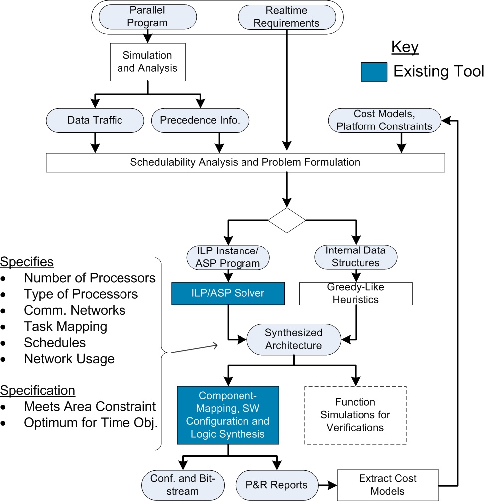 The architectural synthesis flow starts with a MPI parallel program and ends with a bit-stream used for the configuration of an FPGA. In this case, the communication in the parallel program need to be described with MPI (Message Passing Interface). The application is then simulated and analyzed to obtain information about task precedence and inter-task data traffic. This information is used to specify an instance of an Integer Linear Program (ILP) problem [1,2,3]. Additionally, information on processing elements and communication networks, especially their costs and constraints, for a target platform is needed. That is, in the case of Xilinx FPGAs for instance the actual size of the FPGA, costs for the available processing elements, like MicroBlaze soft-core processor or PowerPC hard-core processor or the bandwidth and latency of communication networks. In this approach, the design-space of the ILP problem is not pre-constrained, and the problem dimensions are not ranked. This insures the optimality of found solutions. However, for system requirements, such as real-time requirements, it is sufficient to meet certain timing constraints, so that the interest is not to find the overall fastest solution, but the smallest instead. The solution to the ILP instance is then used to generate an description of the system, which is passed to the tool-chains to generate the configuration bit-stream. Because post-synthesis results could deviate from initial cost models used, new cost models can optionally be extracted after placement and routing to start a new iteration. SoC-MPI [4], a lightweight and flexible communication library, is used for the software-sided communication of the MPI program after the architecture is determined. However, the SoC-MPI library allows hardware-supported MPI functions and currently covers a subset of the MPI-I specification. This methodology is integrated in the PinHaT (Program-independent Hardware Generation Tool) [5,6], which addionally allows other design entries, like the specification and refinement of the architecture by hand. PinHaT currently supports Xilinx FPGAs and to some degree Altera FPGAs. The architecural synthesis flow is currently extended with a semi-automatic parallelization procedure, which allows the user to take a sequential program and parallelize it, as far as the structure of the program allows. The first work in this field is the parallelization of functions and the inserttion of MPI commands [7] to perform communiction. This straight-forward approach will be extended with the parallelization on block-level, especially the parallelization of loops, which in most cases have a high degree of code which can be executed in parallel. On goal of this parallelization procedure is to conserve the original code and not use an intermediate reprersentaion (three adress code). The flow begins then with the parallelization and insertion of MPI commands and ends with the the configuration bit-stream for the FPGA.