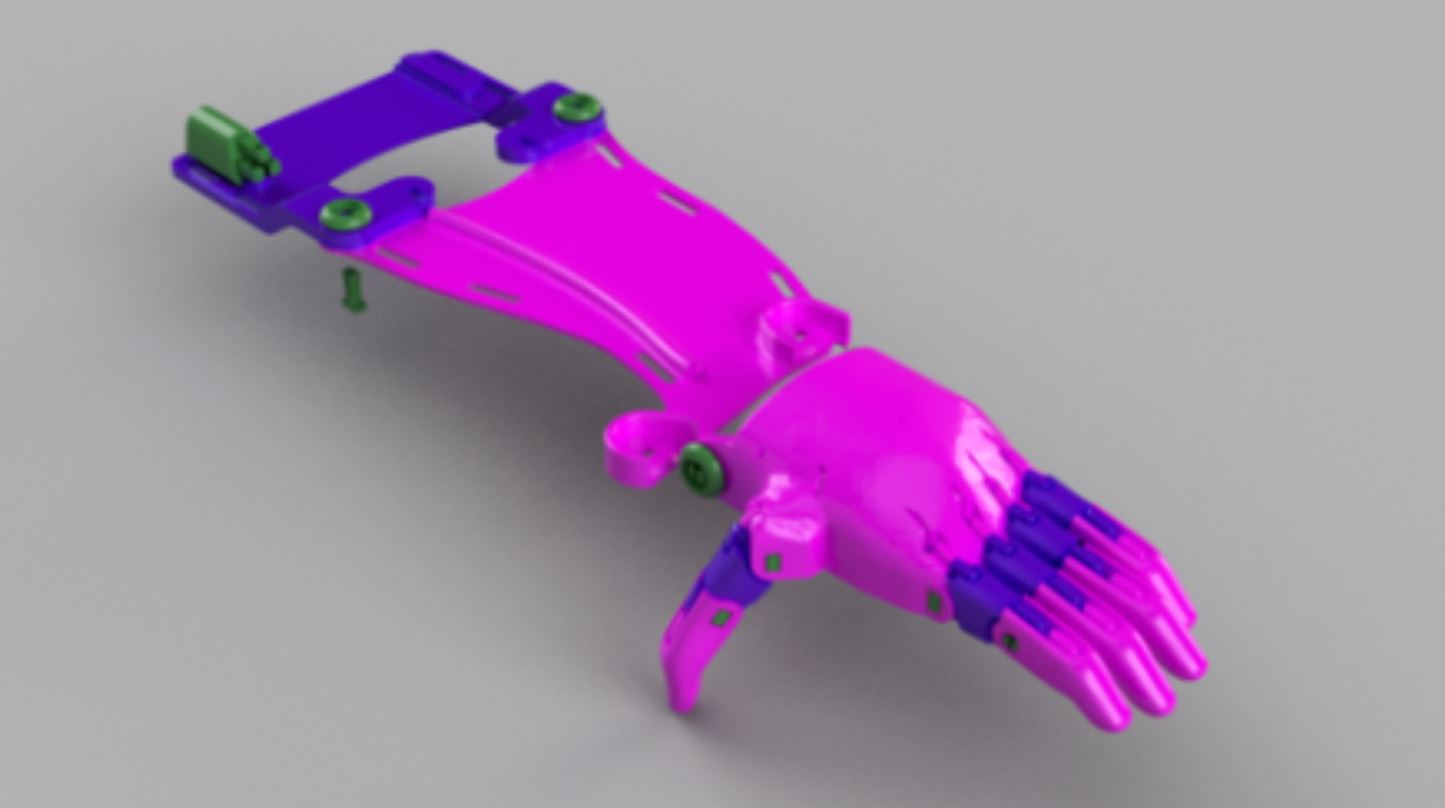 The project team 103 worked on was a left raptor reloaded assembly hand. Using the natural motion of the wrist, the recipient is able to use the prosthetic to grip objects. This assistive device is capable of being adapted into specialized devices such as a drum stick hand or baseball bat hand through other 3D modeling software.