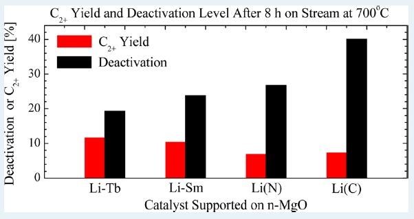 Low-temperature activation of methane and its selective conversion to higher-value chemicals is challenging and has been the subject of numerous studies. Our group has focused on the direct conversion of methane to ethane and ethylene over mixed metal oxides and doped rare earth oxides, with specific emphasis on samarium(III) oxide and terbium(IV) oxide. We have shown that reducible rare earth oxides, such as terbium(IV) oxide, which are not expected to be selective to the oxidative coupling of methane, can with the right combination of promoters and dopants be more active and selective than the corresponding non-reducible oxide, such as samarium(III) oxide ().