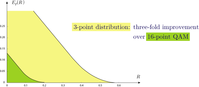 The capacity is approximately tripled, but the large error exponent is even more impressive.