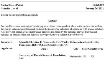Congrats to current and former Schmidt Lab members, Drs. Becky Wachs and Chase Cornelison, on recently issued US patent #10,898,608. This patent covers novel work to decellularize tissues using the process of apoptosis.