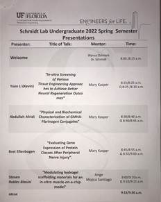 - Steven Robles Blasini (BME), “Modulating hydrogel scaffolding materials for an in-vitro muscle-on-a-chip model”; Mentor: Jorge Mojica Santiago