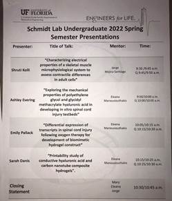 - Emily Pallack (Microbiology & Cell Sciences), “Differential expression of transcripts in spinal cord injury following oxygen therapy for development of biomimetic hydrogel construct”; Mentor: Eleana Manousiouthakis