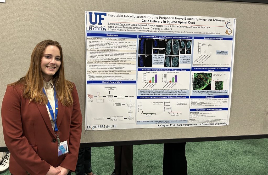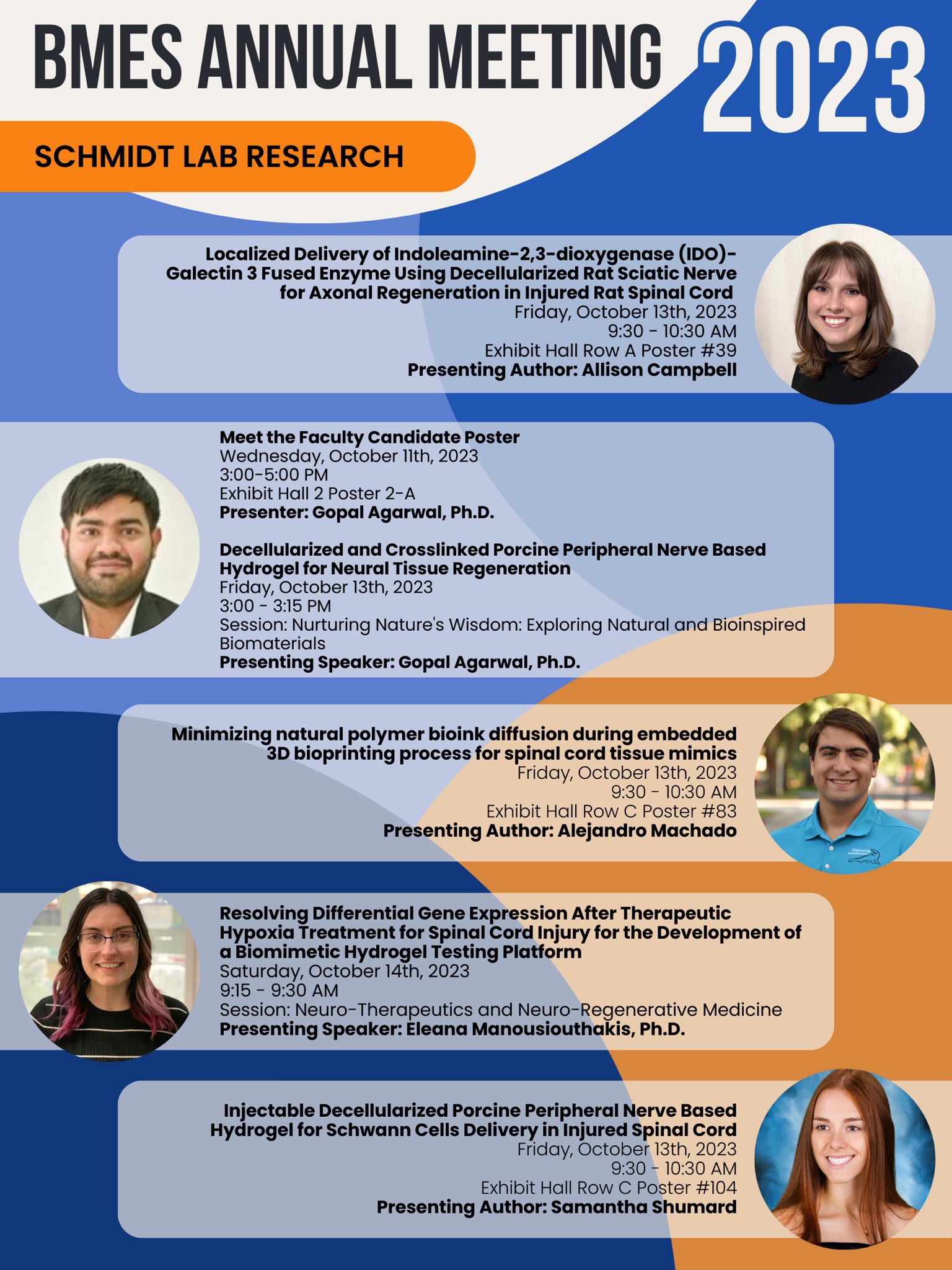 The Schmidt Lab was well represented at the Annual Biomedical Engineering Society (BMES) Conference in Seattle, Washington. Our presenters included postdocs Drs. Eleana Manousiouthakis and Gopal Agarwal, PhD student Allison Campbell, and undergraduate students Alejandro Machado and Samantha Shumard. In addition, Dr. Schmidt gave the BMES Diversity Award Lecture, representing UF BME. Kudos to our entire team for doing a fantastic job!