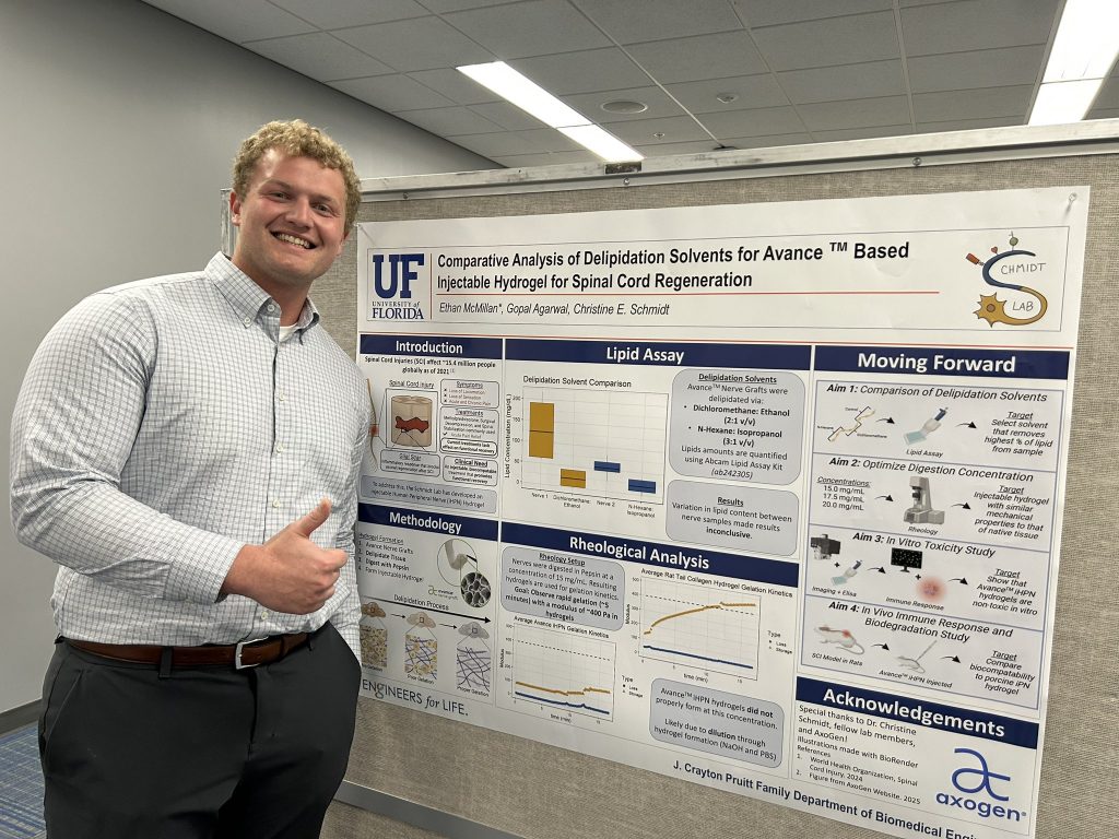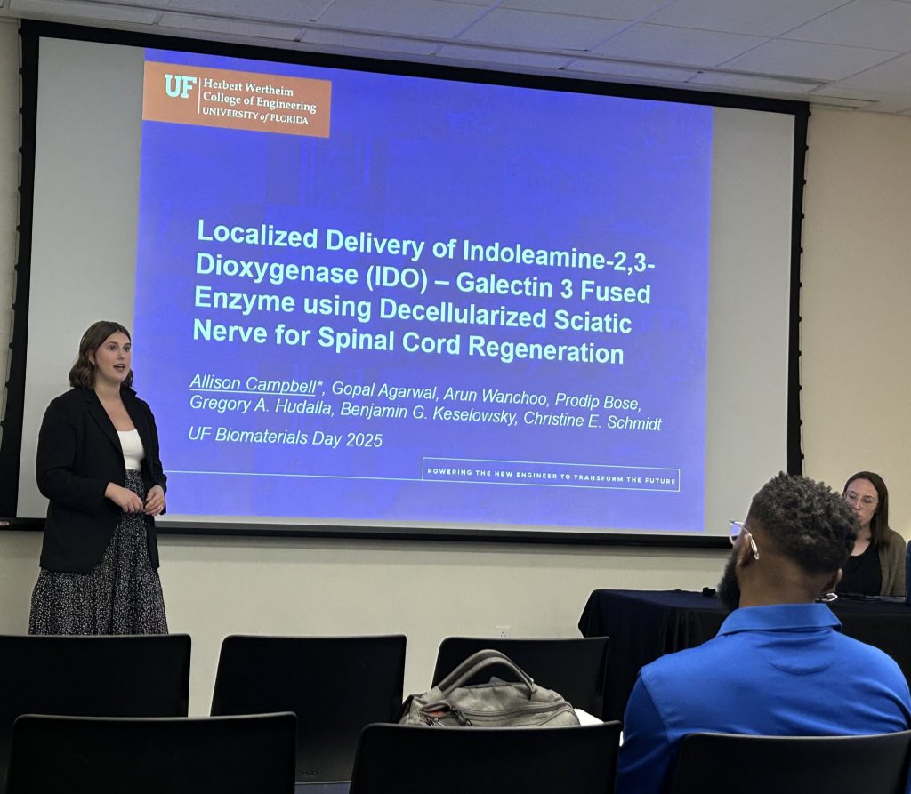 Proud of our Schmidt Lab trainees — Allison Campbell, PhD student, and Ethan McMillan, MS student — discussing their research on developing injectable therapies for spinal cord injury (SCI) at UF Biomaterials Day 2025.