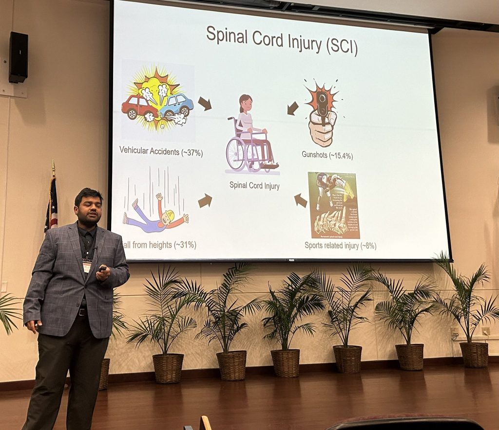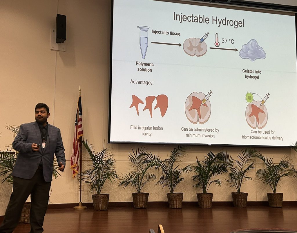 February 7, 2025So proud of our postdoc, Dr. Gopal Agarwal, who gave a fantastic kick-off talk at the North Central Florida (NCF) Chapter of the Society for Neuroscience (SFN). He showcased his impactful work on developing injectable therapeutics for spinal cord injury (SCI) treatment.
