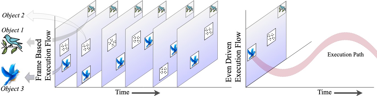 A comparison of frame-based and event-based processing for a scene with three objects is presented in the figure above. Object 1 is a bird sitting on a branch that is on the top right corner of the image. Object 2 contains some insignificant scattered moving objects. Lastly, object 3 is a flying bird that is flying in a serpentine way. In the frame-based processing on the left, each frame is produced after executing each pixel and the frames are produced after a sudden time interval. Conversely, our event-driven processing system, on the right, responds if there is a significant event. Here the processing for object 1 is discarded since there is no temporal change. Though Object 2 has temporal change it does not carry relevant information. Only object 3 has not redundant information and it is our target to perform processing on the serpentine path of object 3 as shown in this figure.