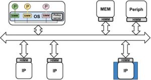 Figure 1 shows the target system-on-chip sought to be generated by mext and operate safely. The tool starts with a user-defined abstract and concrete representation (XML format) of a system and ends up generating a final hardware design with enforced countermeasures for preventing unauthorized access of hardware IPs in the SoC. While setting up the communication network, an access control mechanism that inherits MAC-based authentication policies, found in the flask security architecture, is enforced directly in the hardware design. The architecture of the generated system is shown in figure. The flask security framework is implemented as a decentralized hardware/software architecture with the Hardware IP Management Module (HIMM) that governs access control at the IP level, while the Software IP Management Module (SIMM) manages policies inheritance of security contexts and queries the host kernel security server for associated permissions.