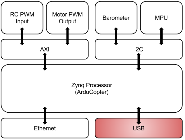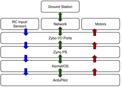 To elaborate on the specifics of the ZyboCopter platform, we utilize a basic hexa-copter frame (including six ESCs and motors) along with a Zybo FPGA acting as a flight controller. A high-level layout of the ZyboCopter is seen in Figure 1. The FPGA hardware design is derived from a base design for the Zybo. This exposes many peripherals to the onboard Zynq processor, such as Ethernet, USB, and I2C ports. Also included are two small AXI-enabled IP implemented for the purpose of converting incoming radio control (RC) PWMs to values and outgoing motor controls to PWMs. The processor is booted with a Linux kernel generated with Xilinx’s Petalinux software. The filesystem, also generated from Petalinux, is replaced with a more powerful Debian OS distribution, specifically Debian 9 Stretch. The filesystem was replaced in order to ease Linux interaction with the inclusion of several command line tools and package managers. Acting as the top level control of the prototype platform, ArduCopter manages all interactions with flight-critical hardware. ArduCopter is the multi-copter program of ArduPilot. It is worth noting again that ArduPilot allows us to apply the control programs rovers, planes, and subs in addition to multi-copter platforms. All that is required is the physical vehicle equipped with applicable hardware. This is of particular interest for a generalized unmanned systems exploration platform.