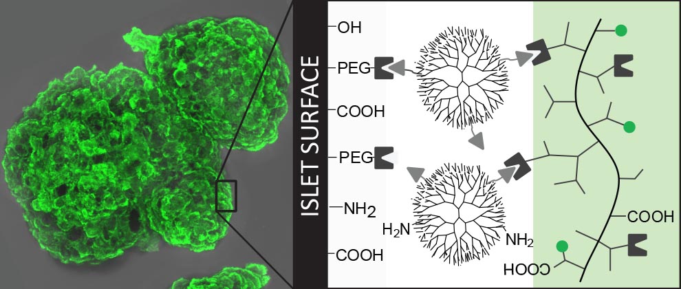Once coated, these polymers can also serve as a platform for the tethering of additional agents, which would subsequently serve to instruct the surrounding host environment or support islet engraftment.