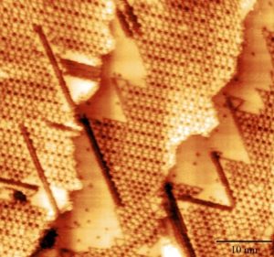 The image on the left depicts the AgOX surface, taken using scanning tunneling microscopy. We are currently identifying different surface facets that the oxide forms to determine which is the most stable and which is the most reactive towards the partial oxidation of alkane adsorbates. This is just one representation of the capabilities we have for the exploration of solid surfaces.