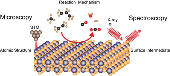 Our research focuses on enhancing the understanding of reactions occurring on solid surfaces on a molecular level. Further, we aim to identify favorable reaction pathways that can be implemented on such surfaces to create value-added products such as olefins. Such reactions are fundamental to heterogeneous catalysis yet remain poorly understood at the molecular level. We investigate surface chemical reactions using a wide collection of analysis methods based on ultrahigh vacuum (UHV) surface chemistry and physics. Mass spectroscopy is employed to ascertain information about surface reaction kinetics as well as adsorbed intermediates. We use low-energy electron diffraction (LEED) and scanning tunneling microscopy (STM) to determine the atomic-scale surface structure of our catalysts. X-ray photoelectron spectroscopy (XPS) is used to ascertain the chemical states of adsorbed molecules and atoms of the solid.